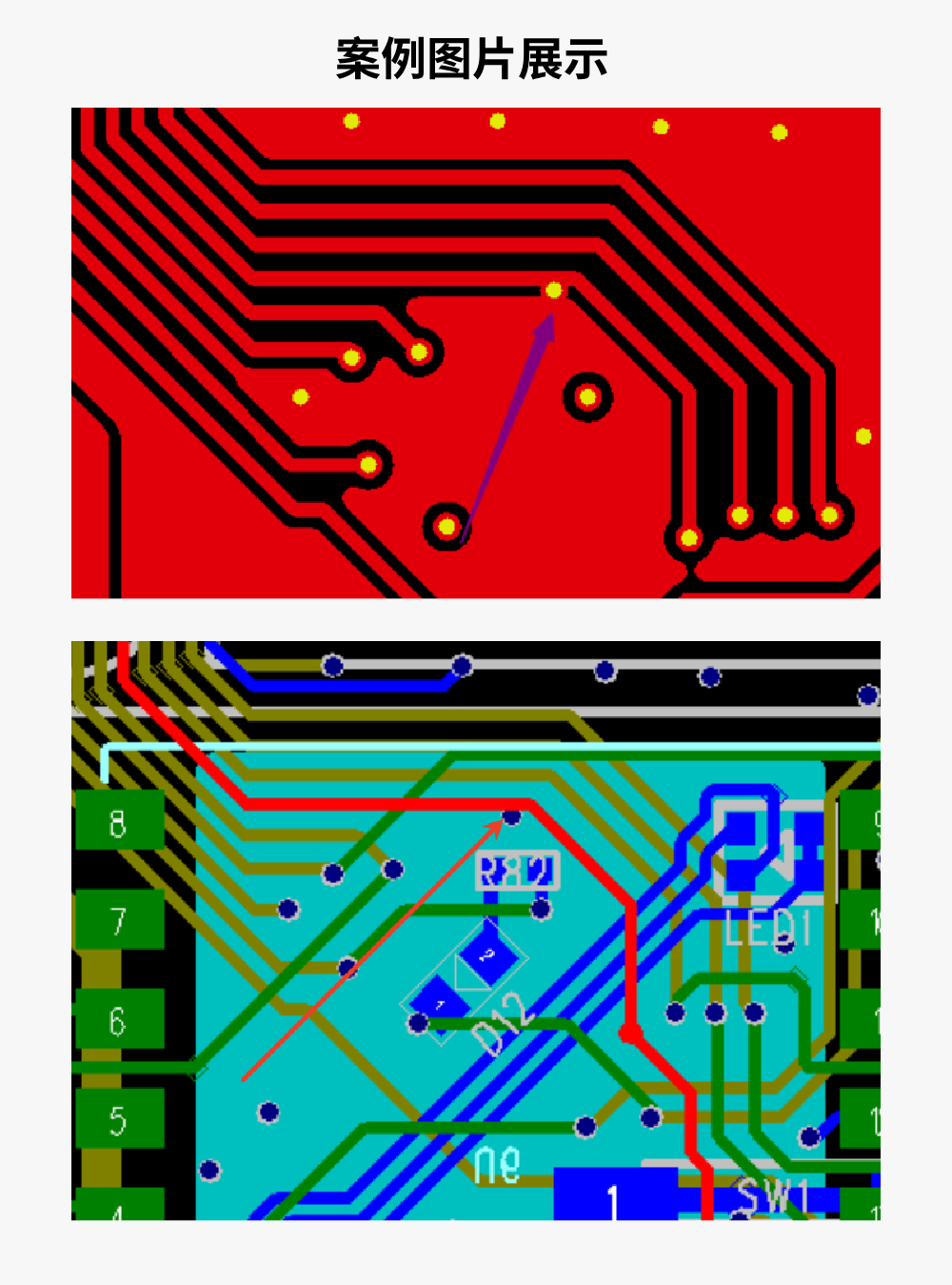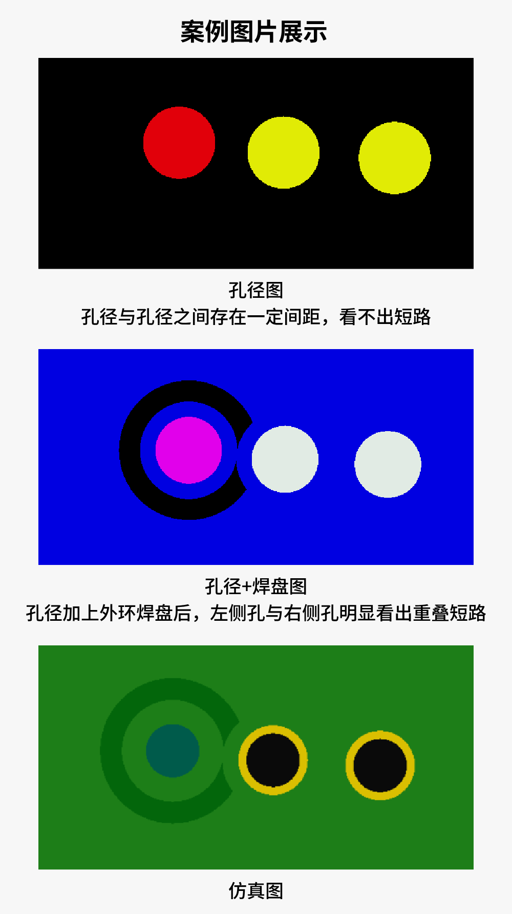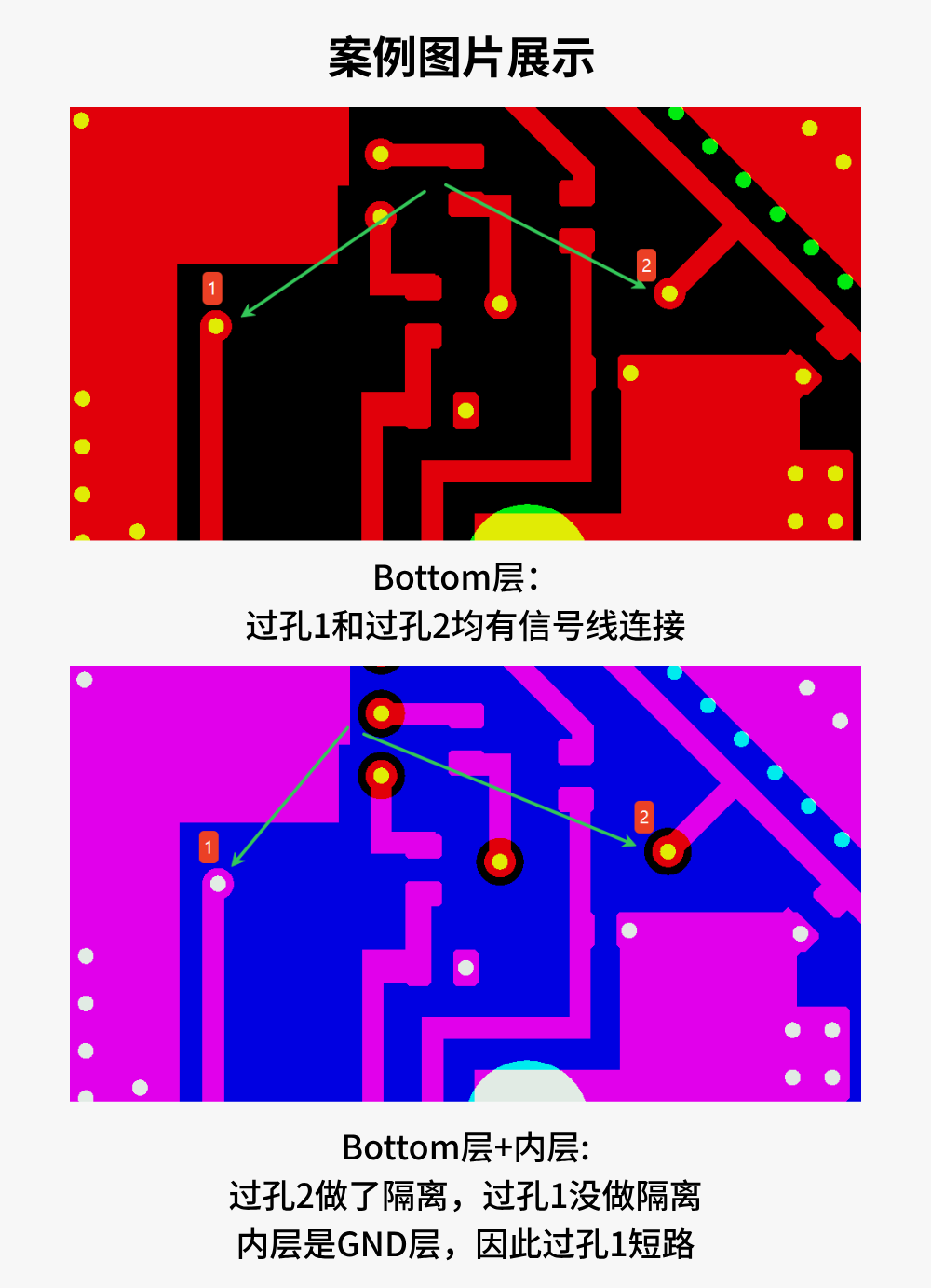 问题根源:过孔与导线、铜皮之间未遵循最小间距要求,设计阶段即存在物理连接风险,生产后直接形成短路。