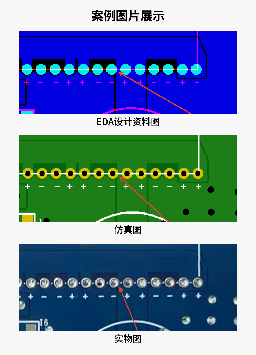 案例解释:左侧孔在第二层与电源(-) 网络连接,而右侧孔网络属性是电源(+) ,并采用了手动铺铜的方式进行走线,因此电源(+) 与电源(-) 区域发生重叠导致短路。