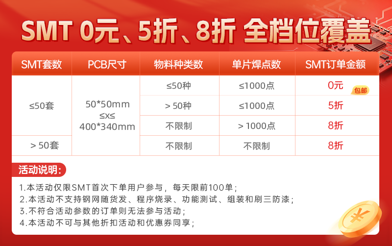 3、本活动免费及优惠仅指SMT,不包含BOM物料费和PCB打板费。