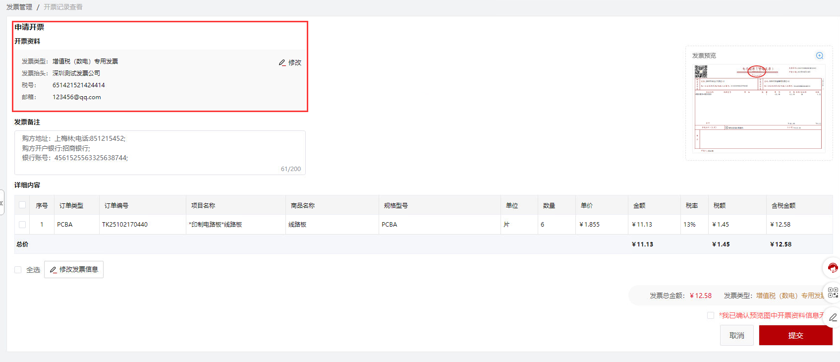 3、PCBA、BOM订单增值税(普通)发票需要手动申请。