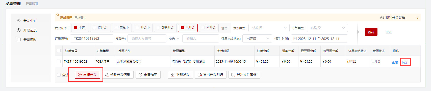 2、元器件订单增值税(普通)发票订单出库自动开,无需手动申请。