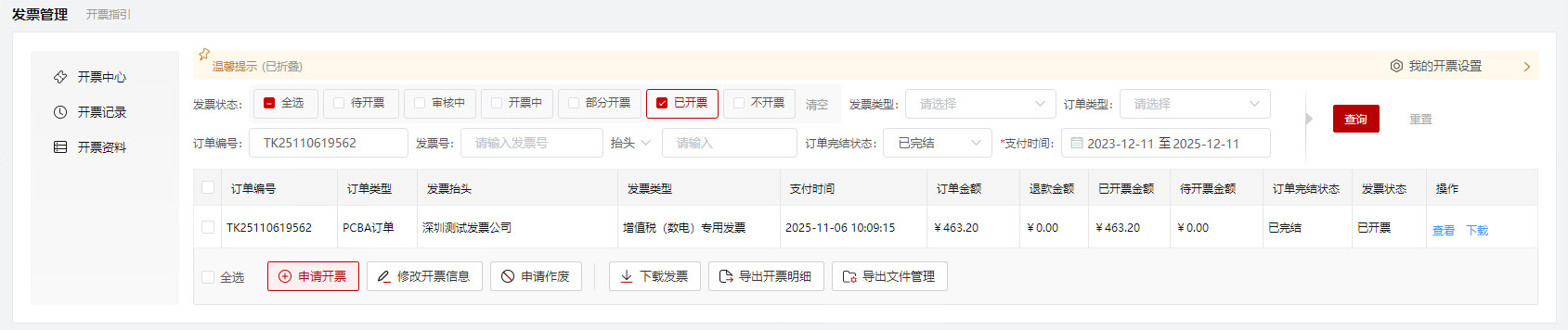 4、PCB订单增值税(普通)发票在订单签收7天后或确认订单后系统自动开票。