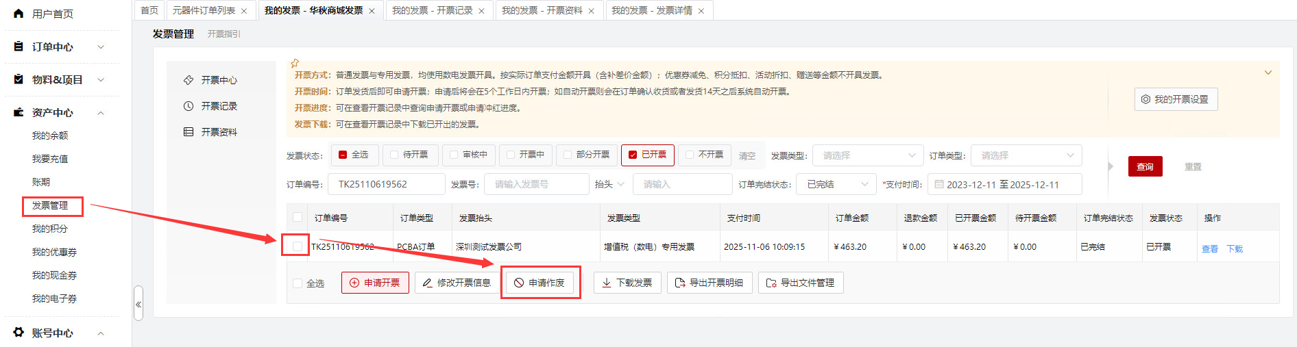 勾选列表需要作废发票的订单,点击【申请作废】按钮