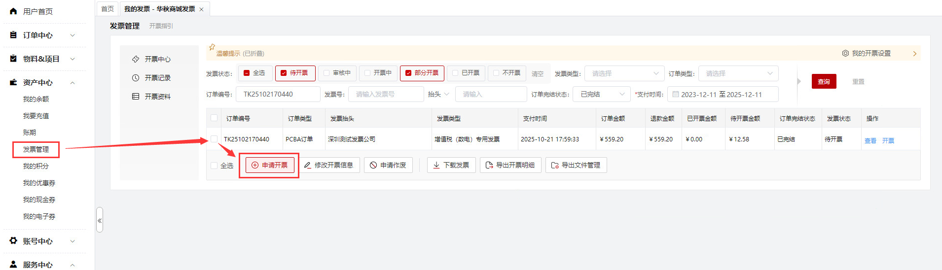登录用户中心-资产管理-发票管理,选择对应业务类型-发票类型-对应订单,点击〖我要开票〗☟