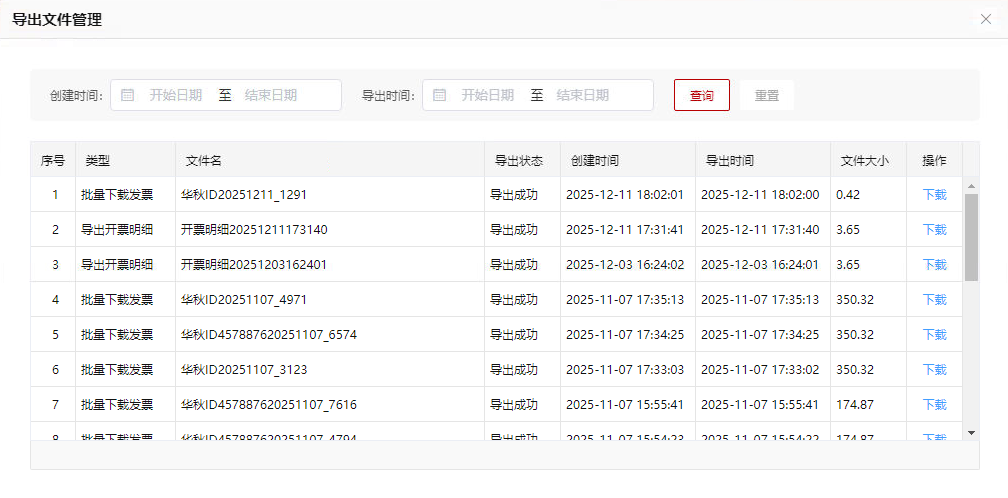 可勾选多个订单批量下载,下载结果请在导出文件管理查看下载。☟