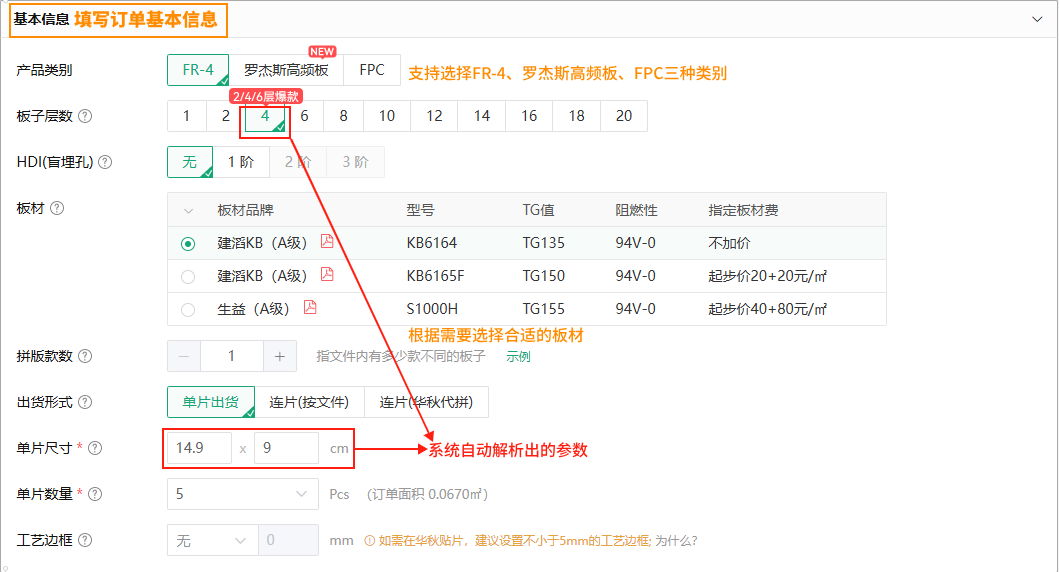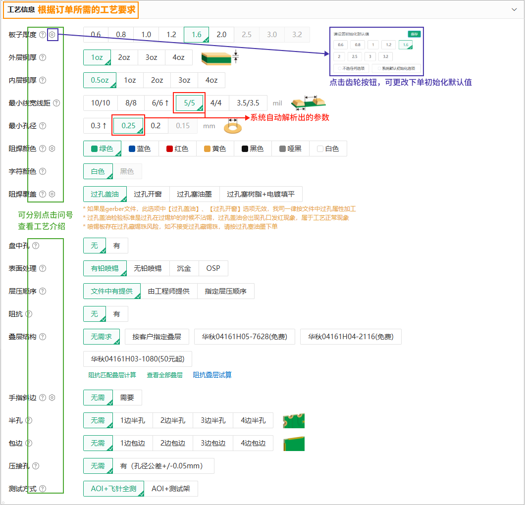 2)页面自动填写板层、尺寸、最小线宽线距、最小孔径参数。