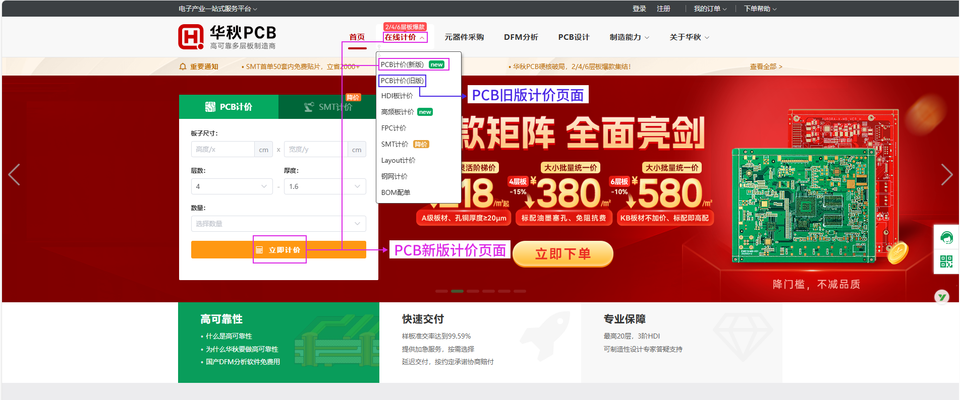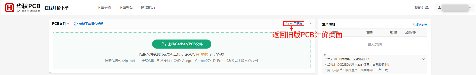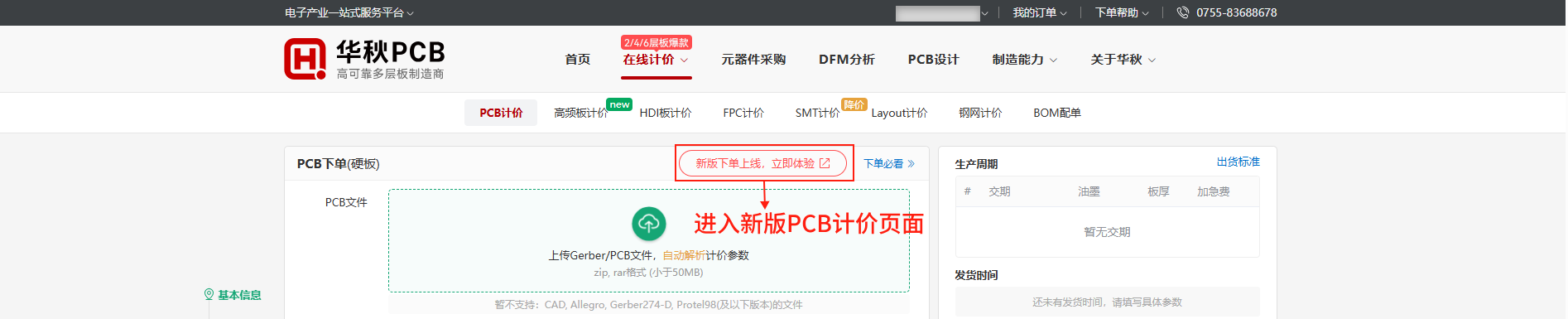 1,从华秋PCB官网进入新版/旧版计价页面