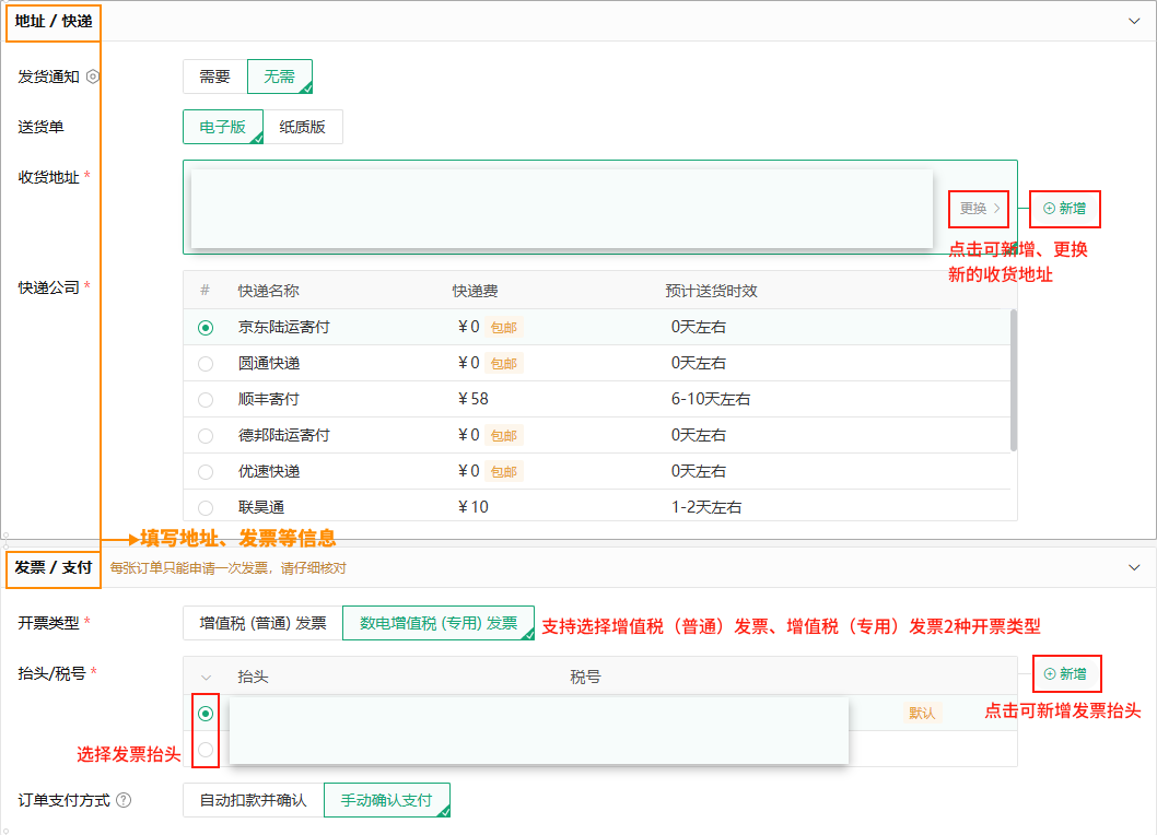 1)地址/快递+发票/支付信息