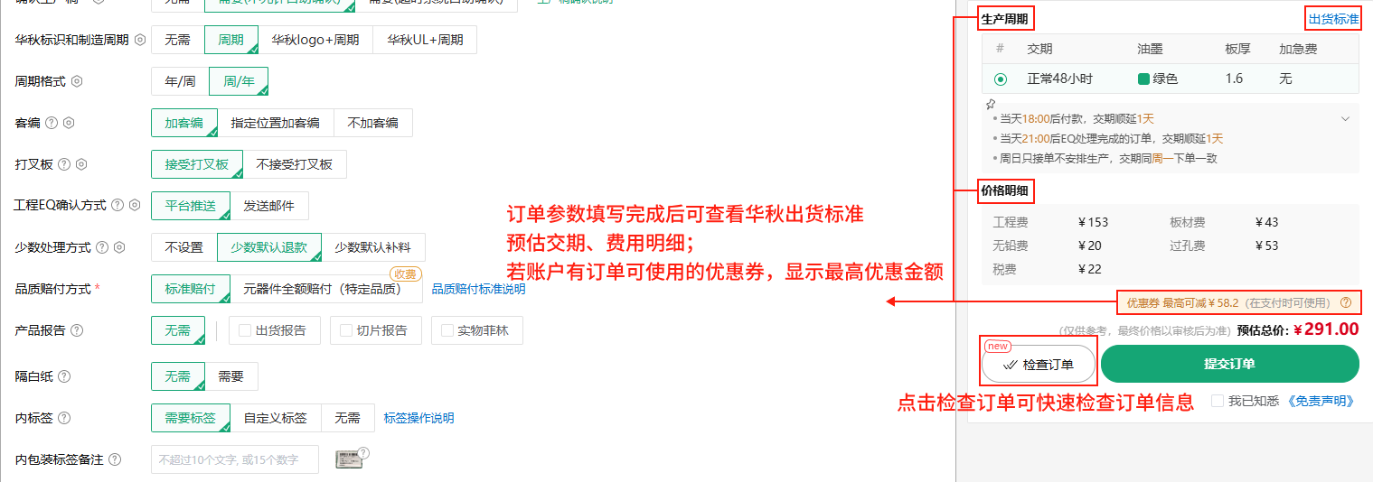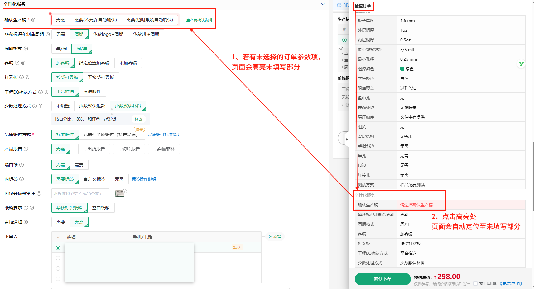 ①先点击【检查订单】快速检查已填写的订单参数,若有遗漏未填写的订单信息,页面会高亮定位至未填写部分;