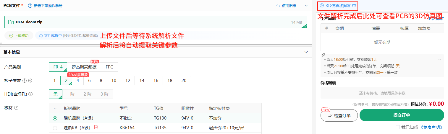 上传文件后等待系统解析下单文件,解析完成后页面自动填写关键参数,并支持在线预览3D仿真、在线查看Gerber