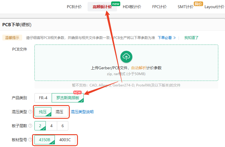 您只需登录华秋PCB官网(www.hqpcb.com),【在线计价】—>【高频板计价】上传您的Gerber文件,填写相关参数;也可点击直接进入罗杰斯板计价页面;即可享受华秋高品质、快交期、极具性价比的罗杰斯PCB制造服务。