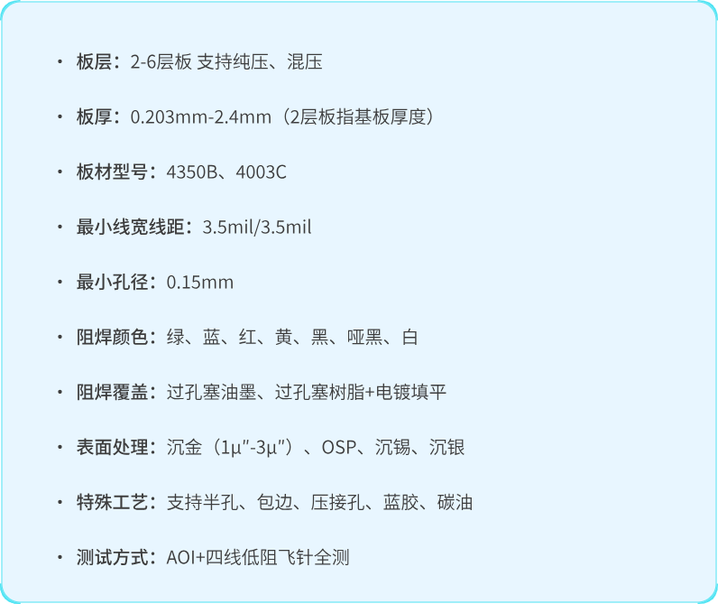 线宽线距支持最小3.5mil,最小孔径支持0.15mm,孔铜平均厚度≥20μm等。