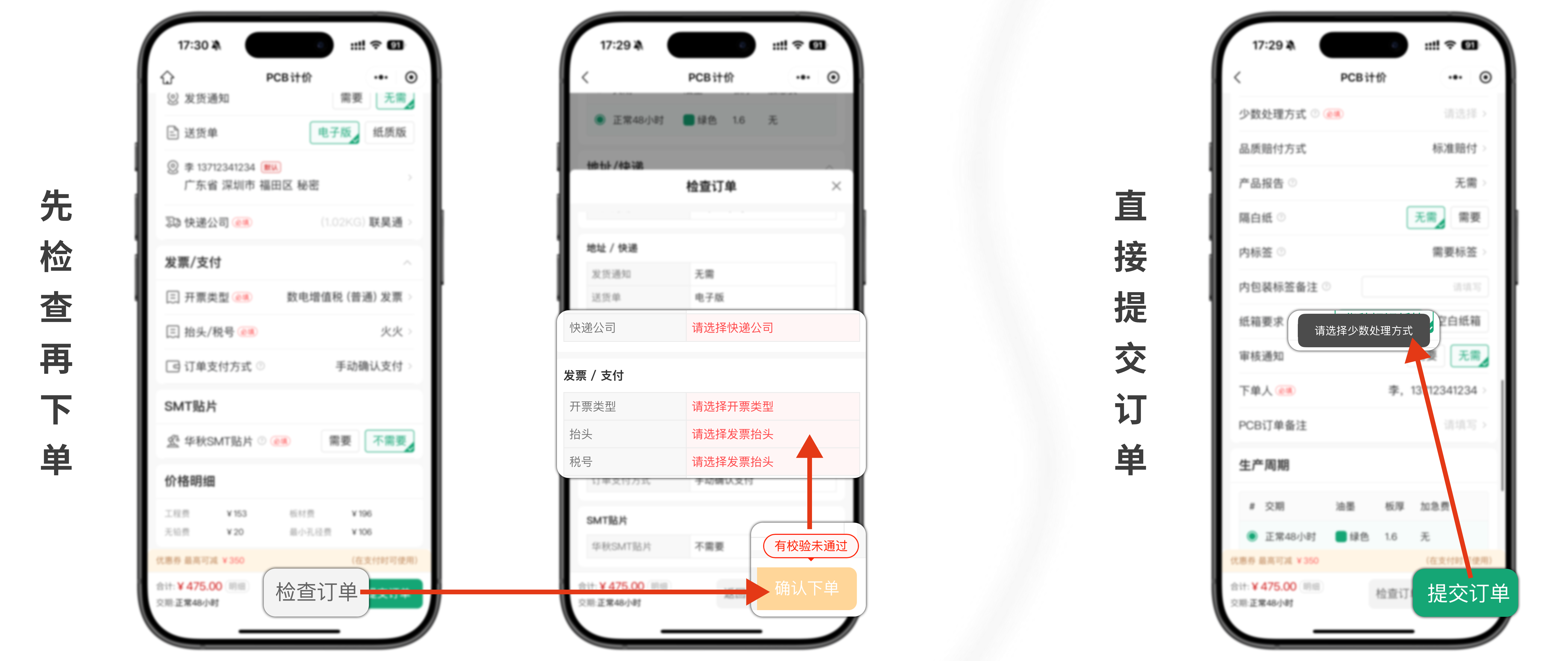 两者区别:如有遗漏未填写项 ,点击【检查订单】可高亮提醒;点击【提交订单】页面弹出提示框并定位至未填写项。