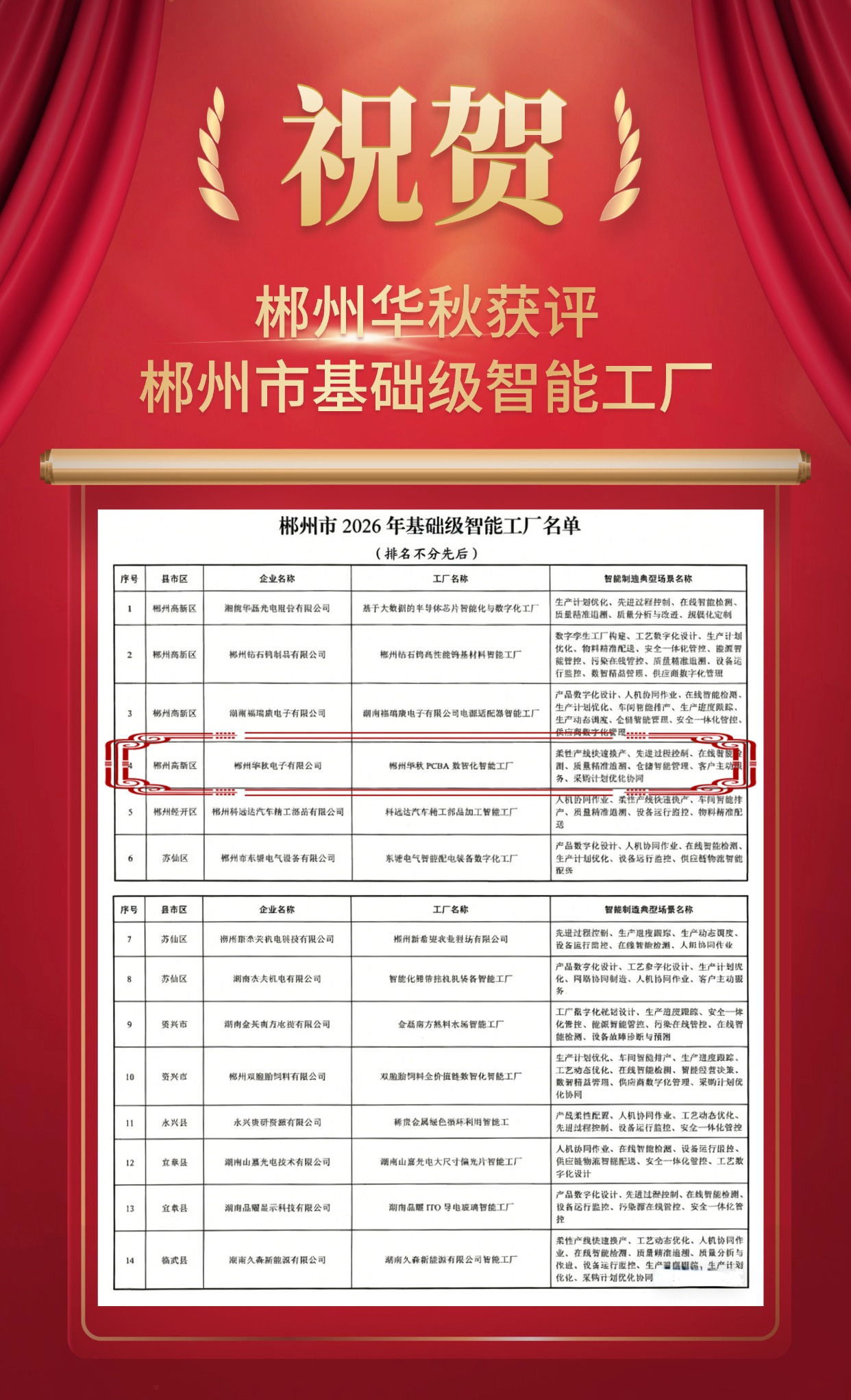 近日,郴州市2026年基础级智能工厂认定结果公布,郴州华秋电子有限公司「PCBA数智化智能工厂」成功获评!这一荣誉是对郴州华秋在智能制造领域建设成果和产业能力的权威认可,也彰显了华秋作为国内领先的产业数字化智造平台的硬核实力。